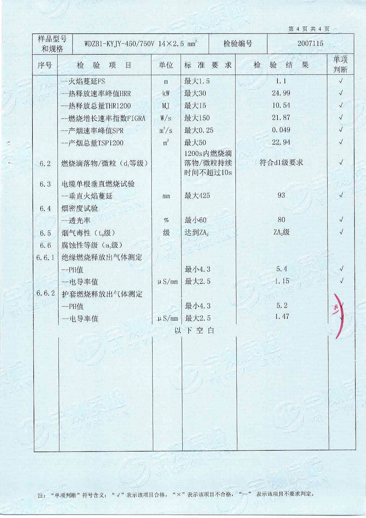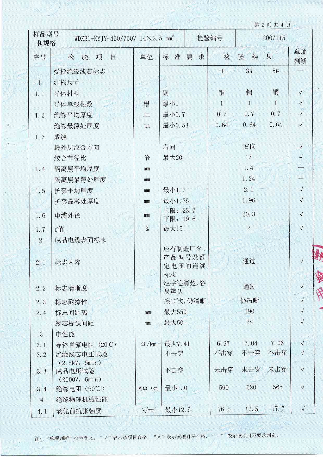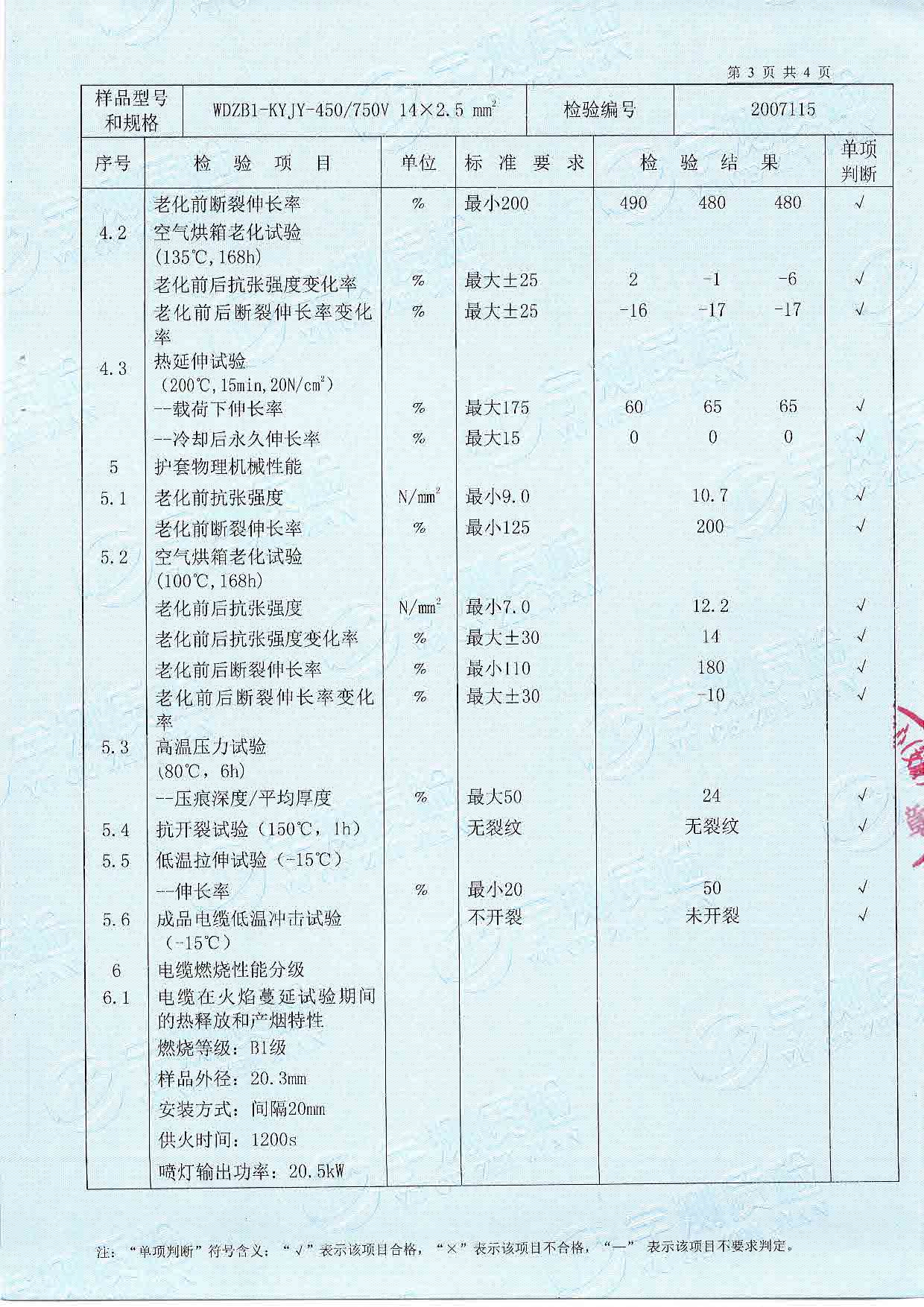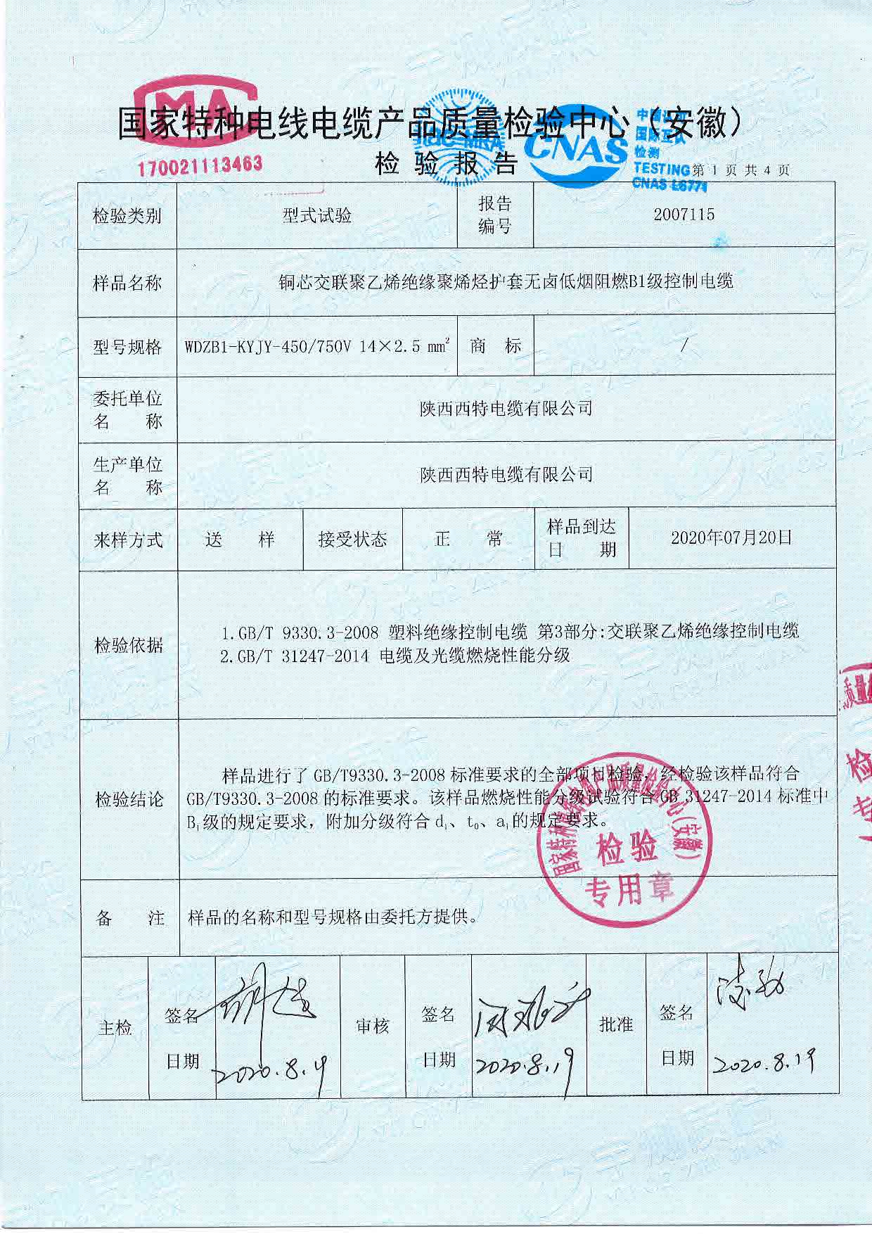 銅芯交聯(lián)聚乙烯絕緣聚烯烴護(hù)套無鹵低煙阻燃B1級控制電纜檢驗報告