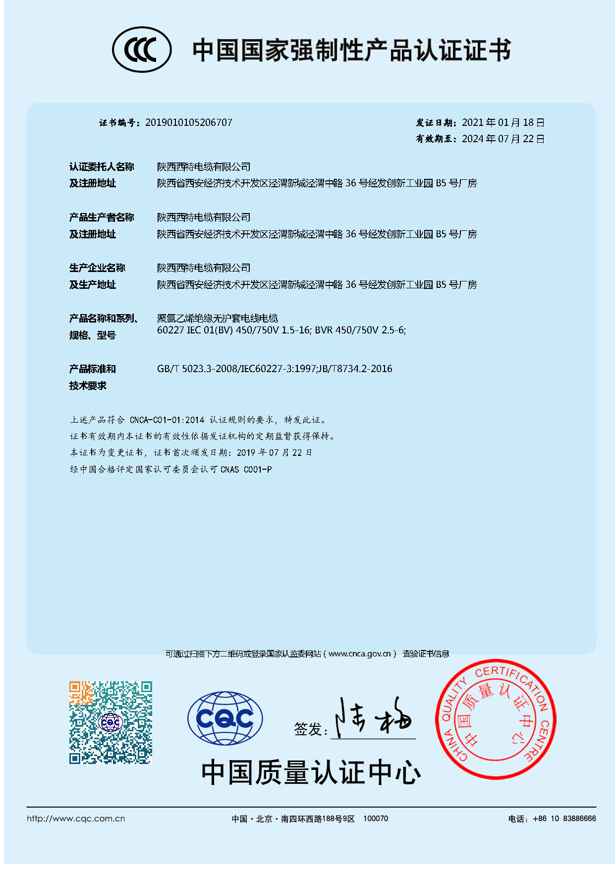 聚氯乙烯絕緣無護(hù)套電線電纜(BV)3C證書